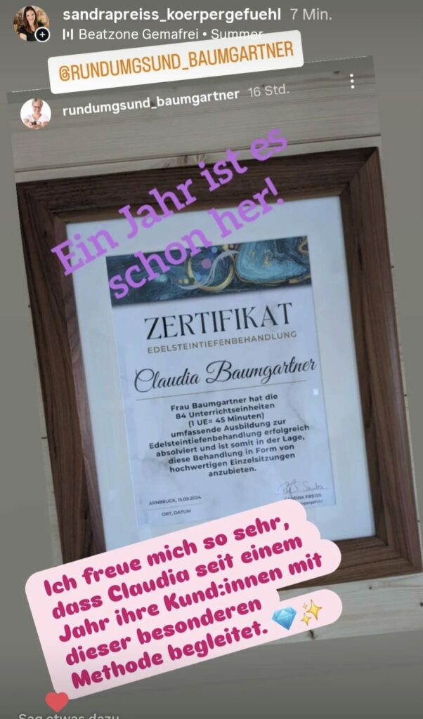 Claudia Baumgartner hat vor einem Jahr ihre Ausbildung zur Edelstein-Tiefenmassage abgeschlossen – 84 Unterrichtseinheiten voller Wissen, Praxis und Inspiration.